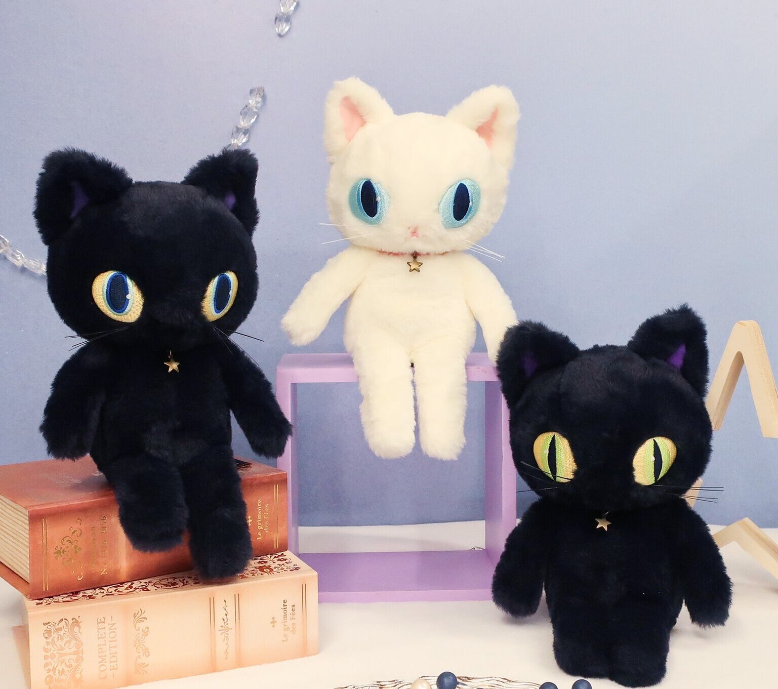 刺繍で細部まで表現した大きな瞳とブロンズ色の星型チャームの首飾りがポイントです。